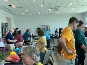 I suddenly realized that our table was missing a covering. When we inquired about it we learned that the festival director (who had promised to provide a tablecloth) was somewhere outside among a mass of people. Even before we could head outside, a volunteer who had overheard us, asked if a teal colored tablecloth would be okay. In an earlier email exchange with the director, I had requested black, and had been told that only navy blue was available. But, now we gratefully said that yes, teal would be great, thank you very much. We quickly placed the cloth over the table, and completed our set-up shortly before the public was admitted at 10:00 am.